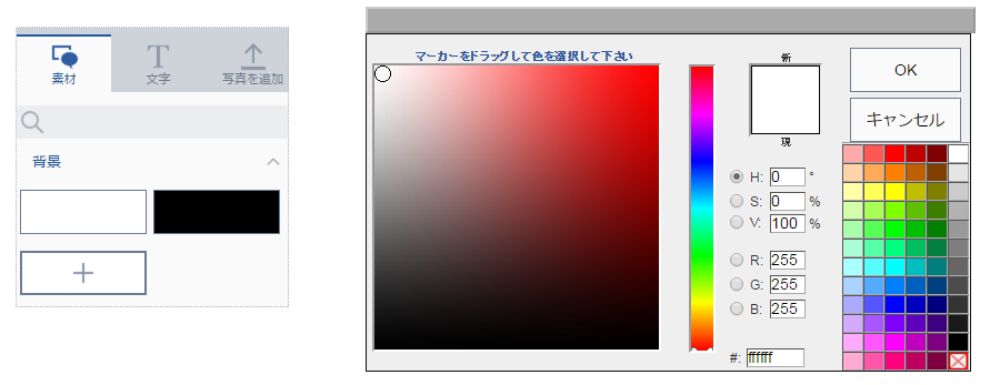 背景色を配置するには、画面右上の「素材」タブから「背景」をクリックし「+」で色の指定を行ないます。