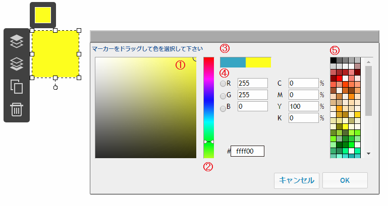 R: Red, 赤 赤の要素。0 – 255 の範囲。255 で赤色。 G: Green, 緑 緑の要素。0 – 255 の範囲。255 で緑色。 B: Blue, 青 青の要素。0 – 255 の範囲。255 で青色。 C: Cyan, シアン シアンの要素。0 – 100 の範囲。 M: Magenta, マゼンタ マゼンタの要素。0 – 100 の範囲。 Y: Yellow, 黄 黄の要素。0 – 100 の範囲。 K: Key plate, キー・プレート キー・プレートの要素。0 – 100 の範囲。 - ⑤ − プリセット。クリックして色を選択します。
