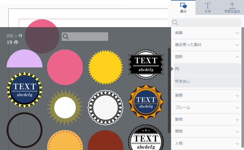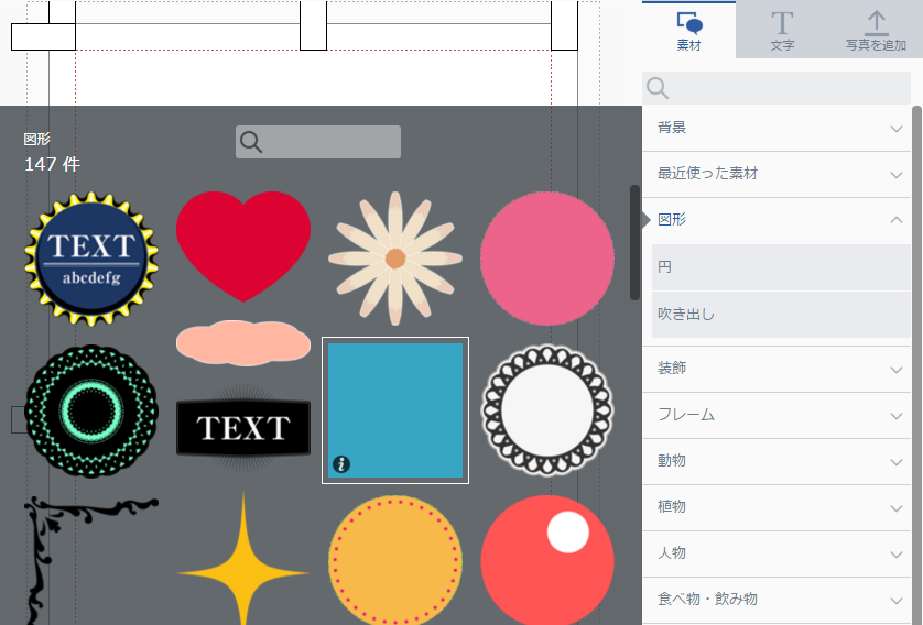 素材を配置するには、画面右上の「素材」タブからを「図形」などをクリックし、一覧から素材をダブルクリック、またはキャンバスにドラッグ&ドロップします。