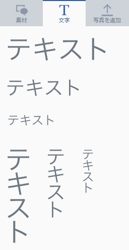 文字を配置するには、画面右上の「文字」タブから「テキスト」をダブルクリック、またはキャンバスにドラッグ&ドロップします。
